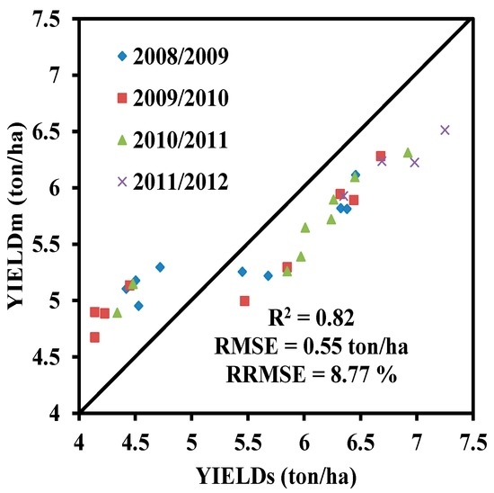 The yield of winter wheat was obtained after the data assimilation. The relationship between the measured and simulated yields is shown in Figure 4 and Table 7. There was a significant relationship between simulated (YIELDs) and measured (YIELDm) yield across all four years (R2 and RMSE values of 0.82 and 0.55 ton/ha, respectively) (Table 7). YIELDs varied between the four growing seasons. The R2 and RMSE values for YIELDs and YIELDm were 0.79 and 0.51 ton/ha in 2008/2009, 0.83 and 0.57 ton/ha in 2009/2010, 0.81 and 0.52 ton/ha in 2010/2011, and 0.89 and 0.61 ton/ha in 2011/2012, respectively. The value of RRMSE ranged from 8.77% to 10.69%. There was a wider range of YIELDs values in 2008/2011 than in 2011/2012 because of the different sowing treatments (Figure 4). A good relationship between YIELDs and YIELDm was also found. Yield was often overestimated when the YIELDm was higher than 5 ton/ha (Figure 4) and underestimated when the YIELDm was less than 5 ton/ha. Table 7 shows that the F values ranged from 0.72 to 0.87. The results demonstrated that the assumption of homoscedasticity was met.