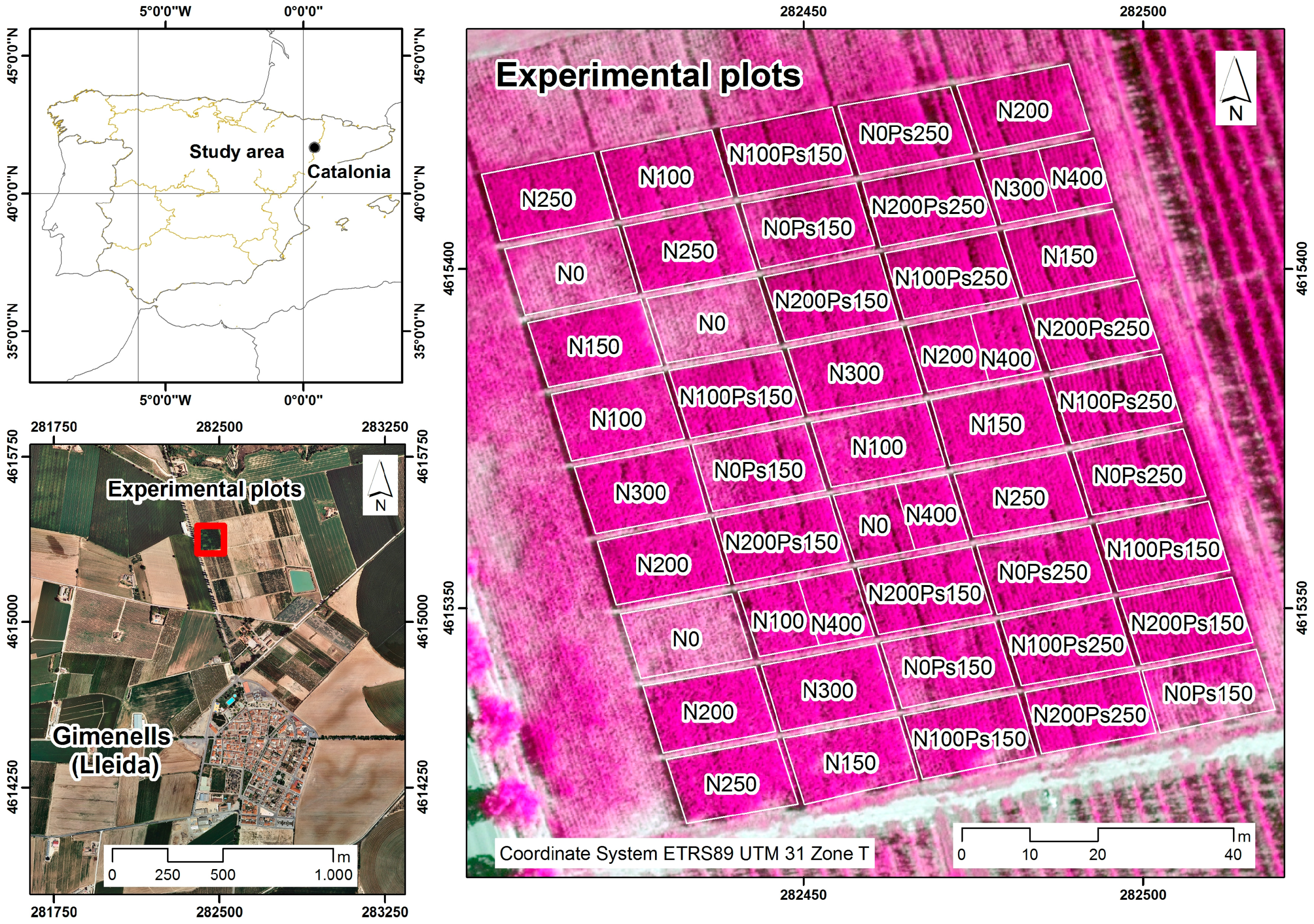 Location of the study area and detail of the experimental plot layout for the maize nitrogen treatments. The background picture is a false colour composition (NIR, Red, and Green) of the image acquired by the UAV on 30 June 2014. The label “N” refers to inorganic nitrogen, “Ps” refers to pig slurry manure, and the numerals express the rate of N applied in kg·ha−1 for each N source.