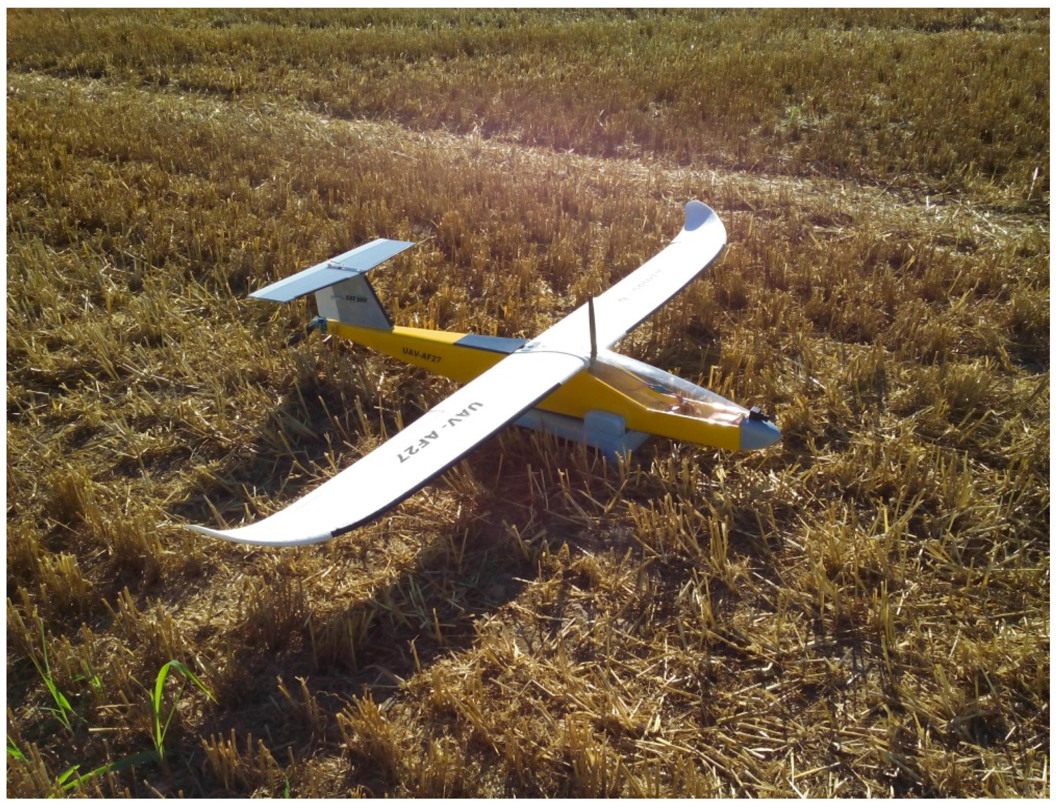 An aerial survey was carried out with the Atmos-6 UAV (CATUAV, Moià, Catalonia, Spain) (Figure 2). This drone has a wingspan of 1.80 m, a length of 1.29 m and a payload of 500 g. The survey was conducted on 30 June 2014, at 10 h (GMT), with maize at V12 stage. The flight height was 180 m above ground, with a speed of 38 km h−1. The time of flight was very short since the area to capture was only about 0.8 ha, and irradiance conditions did not vary during image acquisition. The images were acquired using a VEGCAM-Pro camera, with a 14 Mp Foveon X3 image sensor. This camera has a total weight of 307 g and a size of 110 × 85 × 78 mm. It works in three wide spectral bands: green (525–575 nm), red (615–685 nm) and near infrared (755–805 nm), with a radiometric resolution of 8 bits/pixel (with a pixel value range of 0–255). Other characteristics of the camera include: objective 16.6 mm/F4, sensor size 20.7 × 13.8 mm2, effective pixels 2650 × 1768 × 3 layers, instantaneous field of view (IFOV) 0.0265° × 0.0265° deg.