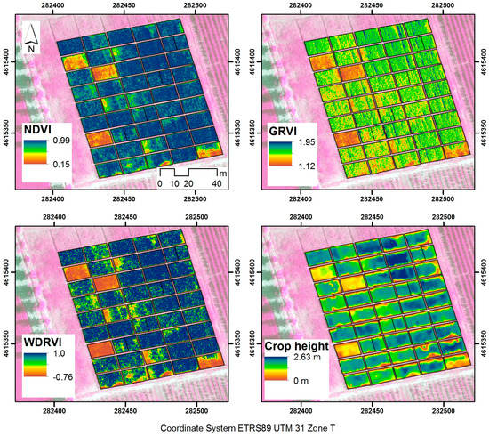 The results obtained led us to conclude that the spectral index derived from the VEGCAM-Pro camera that explained the greatest variability between treatments was the WDRVI. This index had previously only been applied in maize studies at moderate resolution (250 m per pixel) with MODIS data on phenological characterization and yield prediction. In the present case study, at very high spatial resolutions, WDRVI was the best index for distinguishing between treatments with applications above or below 250–300 kg·N·ha−1 and at grain yield prediction at the V12 stage. NDVI and crop height also showed no significant response to extra N application at the economic optimum rate of fertilization, demonstrating their potential as yield predictors at V12 stage. However, SPAD and GRVI either underestimated or overestimated the optimum N rate.