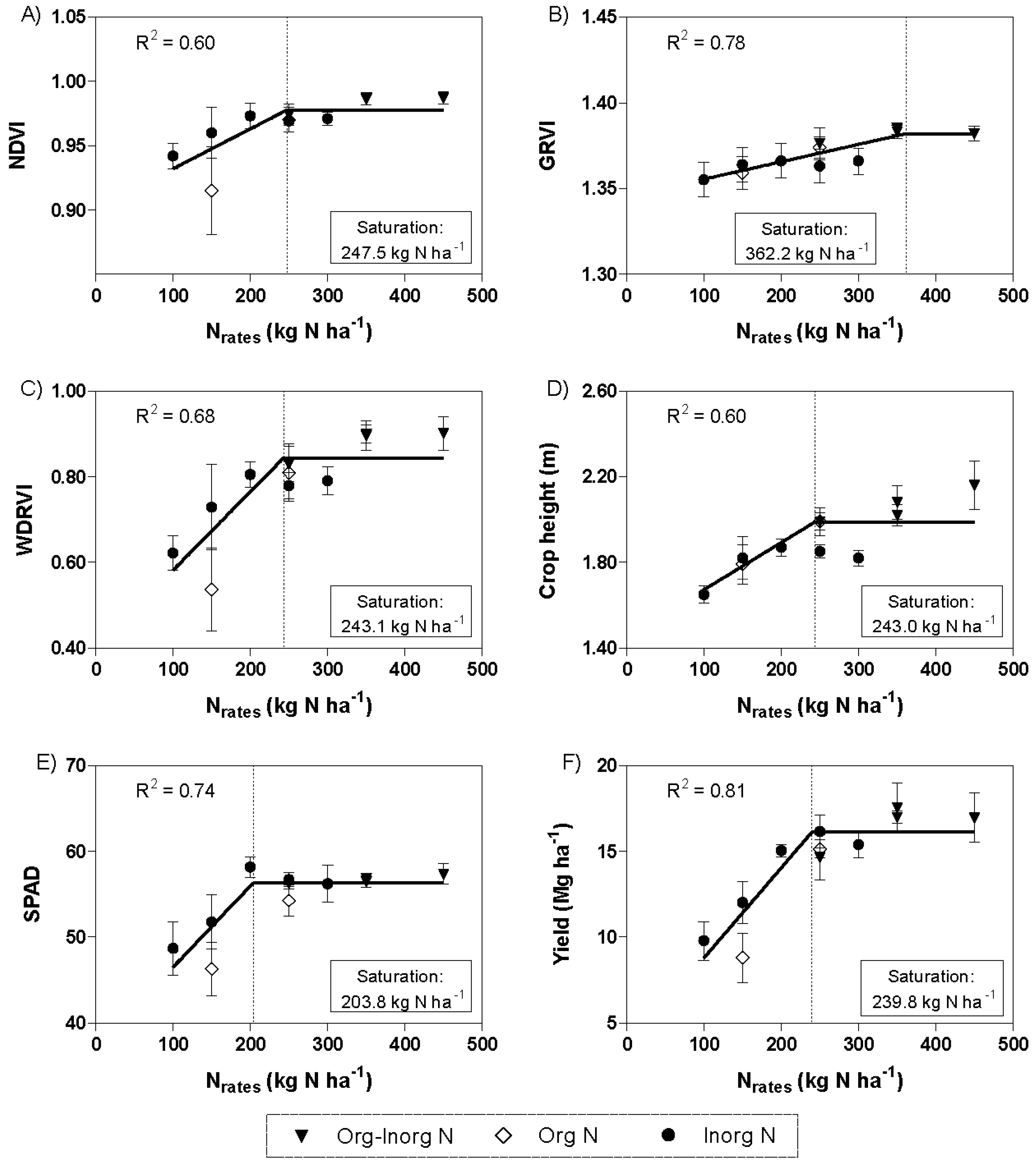 Response of (A) NDVI; (B) GRVI; (C) WDRVI vegetation indices; (D) crop height at V12; (E) SPAD at VT; and (F) grain yield to different N fertilization treatments. Saturation N dose is determined when there is no response to higher N fertilization (predicted economic optimum rate of fertilization). Organic, inorganic and combined organic-inorganic treatments are represented with different symbols. N0 and N400 treatments were not included in the analysis.