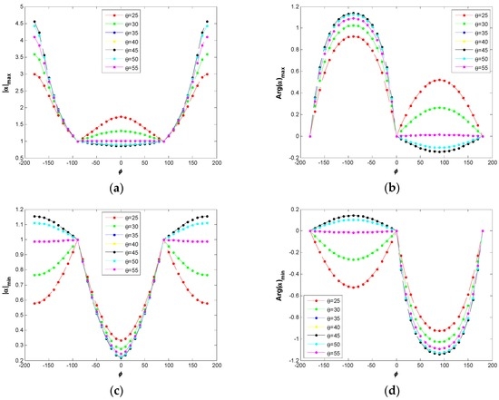 Dependence of magnitude and argument of on polarimetric phase difference at different incidence angles: (a) maximum of magnitude; (b) maximum of argument; (c) minimum of magnitude; and (d) minimum of argument. , , .