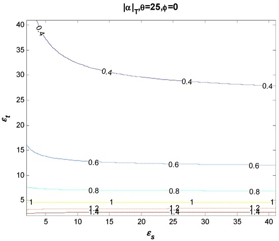 Dependence of absolute value of on the dielectric constant of soil and trunk when incidence angle is 25 degrees and with zero polarimetric phase difference. .