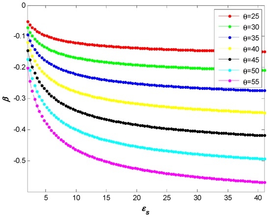 where denotes the minimum value of magnitude of with zero polarimetric phase difference at the incidence angle of pixel . and represent the minimum and maximum value of argument of with polarimetric phase difference of at the incidence angle of pixel , respectively. Similarly, we show in Figure 3 the dependence of on the dielectric constant of soil at different incidence angles. It can be seen that the values of decrease with the increase of and all the values are negative. The domain of becomes wider from near-range (steep incidence angles) to far-range (shallow incidence angles). In the case of , its boundaries can be determined directly by the model. Accordingly, the redefined boundary condition of for pixel is
