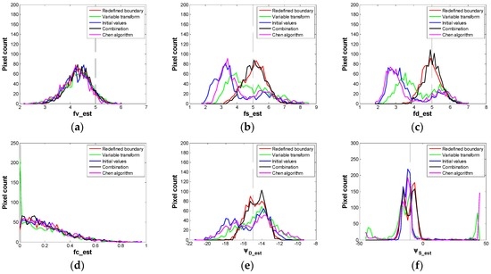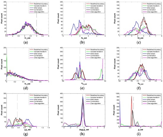 As shown in Figure 5, Figure 6 and Figure 7, the different strategies are labeled with solid lines in different colors: redefined boundary in red, variable transform in green, initial values in blue, combination in black and Chen algorithm in pink. From the histograms, we can see that the inversion of the nine model parameters with the combination of all proposed strategies, as well as with just the redefined boundary strategy, show more robustness in a noisy scenario than the rest of strategies, including the original Chen’s algorithm. Moreover, the combination of all proposed strategies exhibits the highest accuracy.