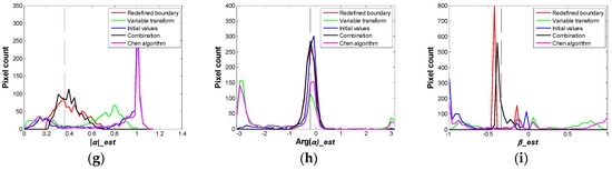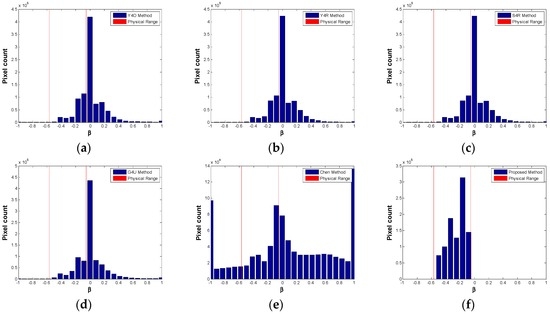 For , because of adopting the magnitude and angle of as the unknown parameters in the equations solving system and adding the constraint of the magnitude in the proposed method, there are no cases where the absolute value of is higher than one. However, 61.01% of pixels in Chen’s method exhibit retrieved higher than one. This is a consequence of using real and imagery parts of as unknowns in the nonlinear optimization processing and without adding the constraint of magnitude in the system.