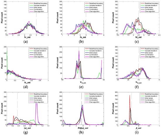 The histograms of inversion result of 9 parameters with different algorithms in Case 3: (a) Volume scattering coefficient; (b) Surface scattering coefficient; (c) Double-bounce scattering coefficient; (d) Helix scattering coefficient; (e) Rotation angle in surface scattering model; (f) Rotation angle in double-bounce scattering model; (g) Absolute value of double-bounce model parameter ; (h) Argument of double-bounce model parameter ; and (i) Surface scattering model parameter . The vertical dashed line denotes the true value.