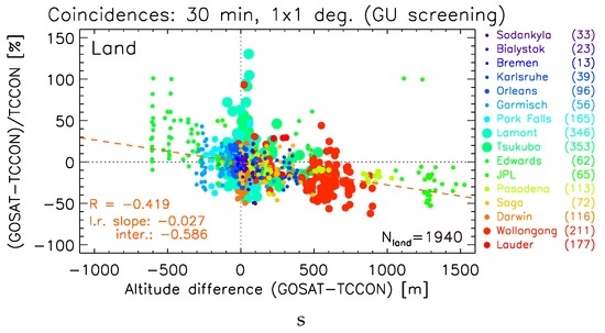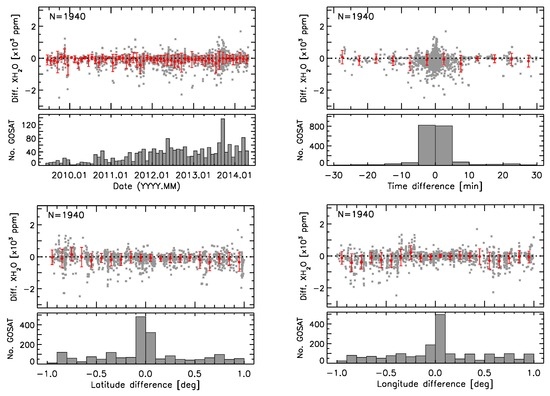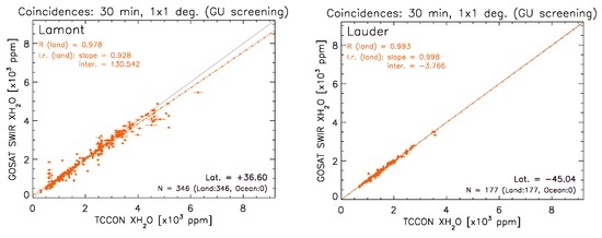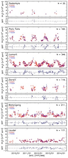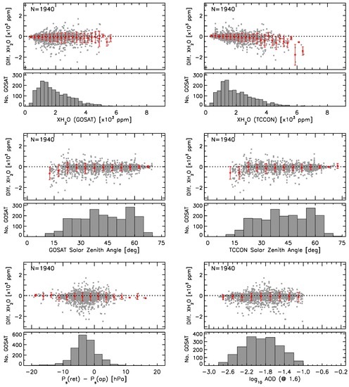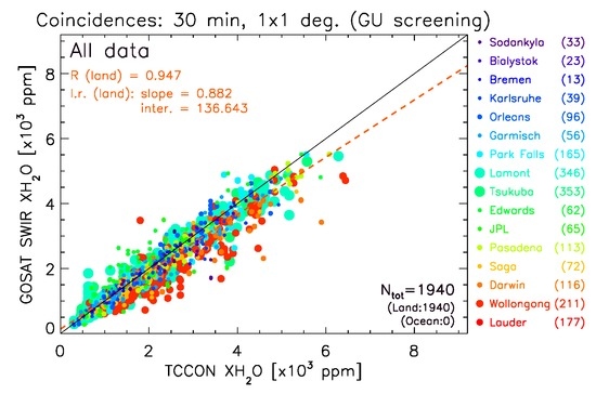 - Dupuy, E.; Morino, I.; Deutscher, N.M.; Yoshida, Y.; Uchino, O.; Connor, B.J.; De Mazière, M.; Griffith, D.W.T.; Hase, F.; Heikkinen, P.; et al. Comparison of XH2O Retrieved from GOSAT Short-Wavelength Infrared Spectra with Observations from the TCCON Network. Remote Sens. 2016, 8, 414. [Google Scholar] [CrossRef]