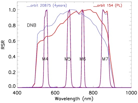 The modulated RSR is derived from a wavelength-dependent optical throughput degradation model developed by NASA VIIRS Characterization Support Team (VCST) [13]. These modulated band-averaged RSRs are generated at different times during SNPP mission, and are used to update post-launch SDR Look-Up-Tables (LUT) to correct the RTA mirror contamination effect [15,18,19,20]. Figure 1 shows DNB and M4–M7 RSRs at orbit 154 (8 November, 2011, same as prelaunch RSRs) and at orbit 20875 (8 November 2015, four years after launch). The near infrared bands have been more affected by RTA contamination than those in the visible wavelength range. In the past four years, the DNB RSR peak wavelength has shifted to shorter wavelengths with the peak RSR wavelength changing from 784 nm to 680 nm. Based on the degradation observation and analysis in the past, the RSRs have been more stable now than in the past, and may change less in the future.