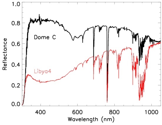 In this study, we also use the Libya 4 and Dome C spectral data recorded by SCIAMACHY to retrieve the TOA reflectance observed by VIIRS. The SCIAMACHY data used in this study is provided by the European Space Agency. The data is the averaged reflectance spectra collected over the study sites from 2002 to 2010. We assume the ground targets do not change significantly and their reflectance spectra are stable over the period of study. The SCIAMACHY data has a very fine spectral resolution (<1 nm) [16]. Thus, SCIAMACHY data can provide high spectral precision measurements of our study sites by sampling several absorption features (Figure 2). These features are within common atmospheric absorption wavelengths and are affected by atmospheric status and ground materials status. SCIAMACHY provides the measured hyperspectral data with enough spectral and spatial resolutions and spectral coverage over the surface sites selected in this study since the SCIAMACHY data are stable and their average data, our input of the hyperspectral data, is constant over time. Thus, any impacts due to the DNB RSR changes can be easily simulated and identified.