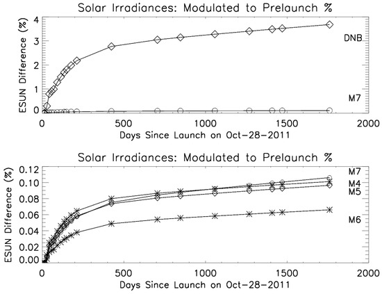 DNB and M4–M7 ESUN difference derived from using the modulated RSRs and using the prelaunch RSRs.