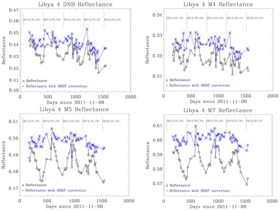 Among all of the selected data, the Libya 4 site view zenith angles are within a narrow range from 1 to 3.5 degrees. The variation of reflectance and radiance are relative to the solar zenith angle. Although the fluctuation patterns are roughly the same, the reflectance with the kernel driven BRDF correction shows less seasonally related fluctuations than a previous study that uses only the Lambertian model correction for DNB and M bands [33] (Figure 4). Our results also find that the longer the wavelength, the better the kernel-driven BRDF correction of TOA reflectance (Figure 4). The solar irradiance has more interaction with the material at shorter wavelengths than at longer wavelengths, thus there is reduced scattering and increased direct reflection at longer wavelengths [38]. This causes an increase in the BRDF at the longer wavelengths. These results confirm that the reflectance for desert sites are slightly non-Lambertian and thus the kernel-driven BRDF model performs better than the Lambertian correction at these sites, especially for longer wavelengths bands.