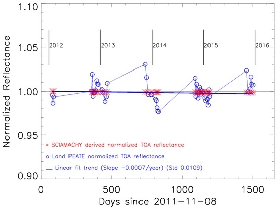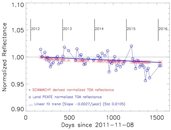 To investigate the VIIRS DNB data calibration stability, a comparison of the Libya 4 DNB normalized reflectance of Land PEATE and SCIAMACHY data is performed (Figure 5). In this figure, the Land PEATE reflectance data are normalized to the first fitted value of the Land PEATE linear fit model. The SCIAMACHY reflectance data are normalized to their first data point. We assume the surface SCIAMACHY reflectance spectra and Solar Irradiance LUT do not change in the past, when the DNB modulated RSR change. The SCIAMACHY derived TOA reflectance has a 1.01% decrease in the past four years. The trend in the TOA reflectance derived from Land PEATE data has some oscillation and the linear fit of the Land PEATE data indicates a 1.03% decrease in the past. The difference between the two trends is relatively small, which demonstrates that the Land PEATE reflectance changes are mostly caused by the RSR changes. Comparing with another study result that used IDPS data on the deep convective cloud reflectance time series [32], our Land PEATE reflectance data at Libya 4 are more stable in earlier days before April 2013. This is because the Land PEATE data have been reprocessed based on the latest version of RSR LUTs and the data are more accurate. After April 2013, both IDPS and Land PEATE data trends are stable.