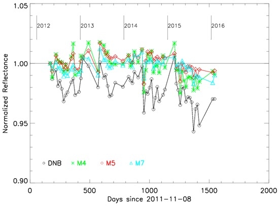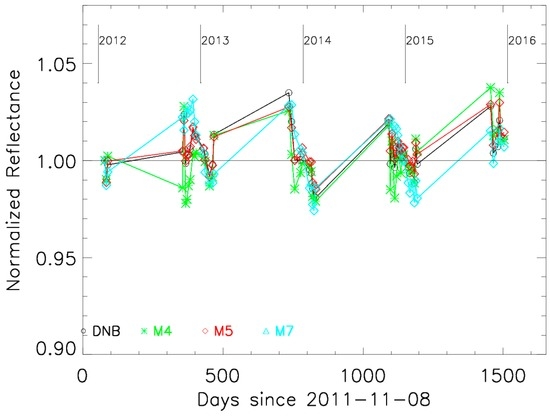 The comparison of Land PEATE DNB and M bands normalized reflectance is shown in Figure 6. In this figure, each band’s reflectance data are normalized to its first data point. The Libya 4 reflectance spectra increase between 400 nm and 900 nm (Figure 2) and the M bands’ RSRs have very little change (Figure 3), thus the normalized DNB reflectance has a larger decrease compared to the M bands when the DNB RSR peak wavelength moves to the shorter wavelength side at later times. For data after 2015, both DNB and M bands have some notable decrease which may be mostly due to surface changes or atmosphere status changes since the RSR change is much smaller than earlier years.
