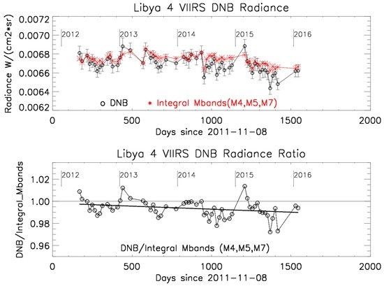 The use of the M band integrated radiance is to simulate the DNB, thus, ideally the ratio of the two is 1. Currently, the weights for M bands are changed with time due to the RSRs change and the ratio between DNB radiance to integral M bands radiance ranges from 1.01 to 0.97 (Figure 7). The fitting trend indicates that the DNB to integral M band ratio has a 0.75% decrease at Libya 4 site, which is partly due to the fact that the M bands used for integration are insufficient to simulate the whole DNB bandpass.