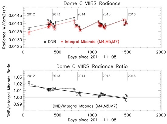 The Dome C integral M bands radiance from M4, M5, and M7 bands are compared with the DNB radiance in Figure 10. Their seasonal oscillations are very similar and the values are close. In Figure 10, the mean values and 1 standard deviation error bars of the DNB 32 × 32 pixels are indicated and the percentages of standard deviation range from 0.29% to 1.45%. For M4, M5, and M7 bands, their individual percentages of standard deviation range from 0.19% to 1.73%. The ratio between DNB to integral M bands radiance ranges from 1.02 to 0.99, with about 3% difference. The ratio at the Dome C site is slightly different from the Libya 4 site because the surface spectral characteristics are different, though the modulated RSR changes are the same. The linear fitting trend indicates the DNB to Integral M bands ratio has decreased about 1.9% in the past four years.