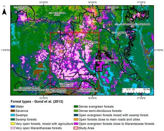 Vegetation map of Gond et al., (2013) [26]. In black, the extent of the logging concessions (Source: Interactive Forest Atlas of the Republic of the Congo [27]). In red, the study area.