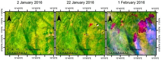 Burnt areas are identified according to the difference in the value of two vegetation indices between each date and the base mosaic. Both the Normalized Difference Water Index (NDWI; also known as the Normalized Difference Moisture Index, NDMI) [44,45] and the Normalized Difference Vegetation Index (NDVI) [46] are used to detect burnt areas on the S2 images. The NDWI is calculated according to the formula of Gao [44] and adapted to S2, using the NIR band 8 (842 nm) and the SWIR band 11 (1610 nm). The use of the band 11 constrains the spatial resolution of the product to 20 meters. The NDVI is calculated using the NIR band 8 (842 nm) and the Red band 4 (665 nm). The recent passage of fire causes a drop in the two indices’ values (the respective thresholds for the difference value are set to 0.18 for NDWI and 0.19 for NDVI). Very few fires occurred before the 12 January 2016 and the few burnt areas present on the 1 January 2016 image have been delimitated on that image with a specific threshold for NDWI and NDVI values.