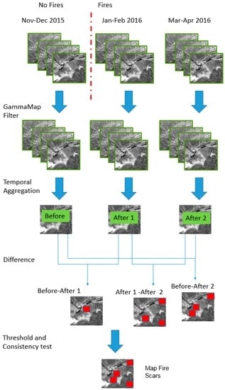 The S1 images available in this study were acquired with the Interferometric Wide swath (IW) acquisition mode at 25 m spatial resolution. In total, 24 images are available from December 2015 to April 2016. The methodology employed to delineate the fire-affected area is carried out in the following steps and summarized in Figure 3: (1) map Gamma filter correction; (2) temporal aggregation of S1 imagery; (3) calculation of backscatter differences between consecutive periods; and (4) threshold application and consistency test. All SAR images are first corrected using Map Gamma filter technique described in Lopes et al., [58] to reduce speckle. Map Gamma is an adaptive filters that reduces the variance (i.e., speckle) within the image while preserving both radiometric and spatial resolution. The filter is based on the assumption that the (unspeckled) intensity of the scene is gamma distributed. The filter minimizes the loss of texture information and it is thus suitable for a wide range of gamma distributed scenes, such as forest and agriculture areas.