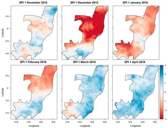 Analysis of the recent rainfall trends with respect to the long term (1981–2010) average, show an excess in precipitation in late 2015, followed by a drought at the time of the fires. In Figure 4, SPI values more negative than −1 indicate a condition of drought. The more negative the value the more severe the situation. SPI values higher than +1 indicate more humid conditions compared to a normal situation. When the SPI has a value between −1 and +1 the situation is identified as normal. The SPI results support the initial observation. An unusually wet November is followed by severe droughts for the months of December to February 2016 in the North of the Republic of Congo.