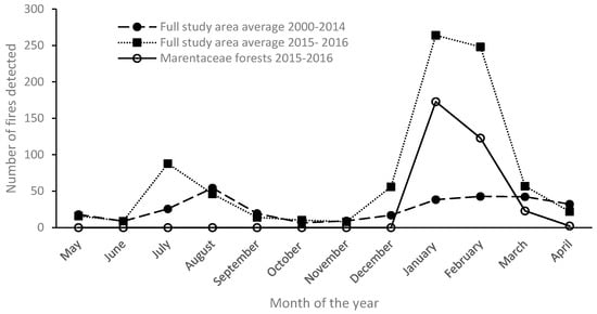 Examining the fires by land cover classes shows that the three months from December 2015 to February 2016 were characterized by an exceptional number of fire outbreaks, with nearly seven times as many fires occurring in January 2016 as would normally be expected from the long term average. The monthly average May to April calculated from the 2000 to 2015 period is shown in Figure 5, along with the period from May 2015 to April 2016, both for all land cover types and specifically the Marantaceae forests. On average, for the 2000–2015 period, Marantaceae forests were affected by one or two fires at the turn of the year. In January and February of 2016, 173 and 123 fire detections were counted, respectively. A few fires are observed in March 2016. Over half of the increase in fires this year occurred in these forests.