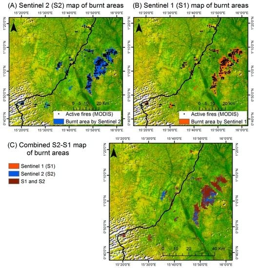 The limitations of the individual systems are reduced by using both S1 and S2. Figure 10 illustrates the extreme cases for each sensor. In Figure 10A, S2 detects burnt areas (in blue) while S1 does not, probably because of a less severe fire. In Figure 10B, however, S1 (in orange) detects burnt areas that were not detected by S2 due to high cloud coverage.