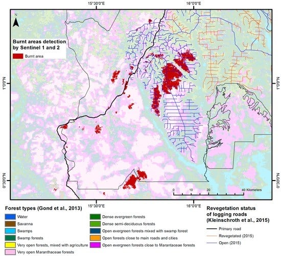 Only a certain proportion of Marantaceae forests were affected by fires. According to Gond et al., [26], Marantaceae formations in the study area occupy more than 300,000 ha. To understand the distribution of the fire, we looked at the logging roads network and the accessibility in general. For the burnt areas observed in historically logged areas in the north (Figure 8A), the origin of the fires is adjacent to old logging roads. The roads were identified by Kleinschroth et al., [31] as not yet entirely recolonized by vegetation in 2015. Although these roads have been closed and are no more used for active logging exploitation, they may have remained partly accessible for people on foot. In Amazonian and Indonesian tropical forests, the presence of recent logging roads has been reported as a potential facilitator for fire in forests [8,10,61].