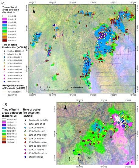 Timing of the burnt areas detections with Sentinel 2 together with the MODIS active fire product in the north of the Republic of Congo. The logging roads come from [31]. (A) In the north of the study area. (B) In the south of the study area.