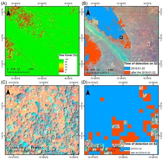 (A) Percentage of tree cover derived from a 2011 GeoEye image; (B) Burnt areas in 2016 detected on Sentinel images; (C) Zoomed in GeoEye image showing the transition from very open canopy to open forest canopy; and (D) Timing of the detection of burnt area for the magnified image. Fire happened first in the more open areas.