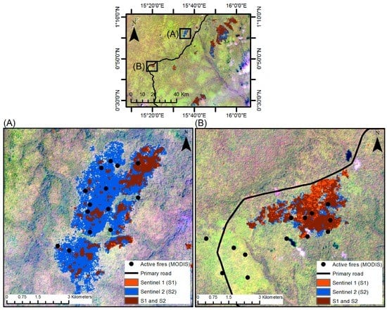 Examples of complementary use of Sentinel 1 and Sentinel 2 data in two specific zones of the study area (A) and (B). Areas detected only by Sentinel 2 are in blue, only by Sentinel 1 in orange and areas detected as burnt by both sensors are in dark red. Active fires (MODIS) are represented by the black dots.