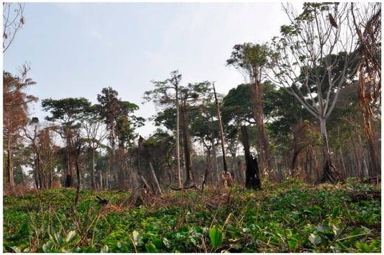 The actual impact of the fires on the tree mortality, tree cover density and longer term effects are difficult to assess at this stage. However, a field visit to one of the affected areas three months after the fires showed that the flames had reached the crowns of the trees, some 20–30 m high. The regrowth of the Marantaceae was already clearly visible as illustrated in Figure 11. Marantaceae, being pioneer plants, easily invade new open areas (following natural or anthropogenic disturbances). Doing so, they prevent the regeneration of trees and lead to an opening of the forest canopy cover [35].