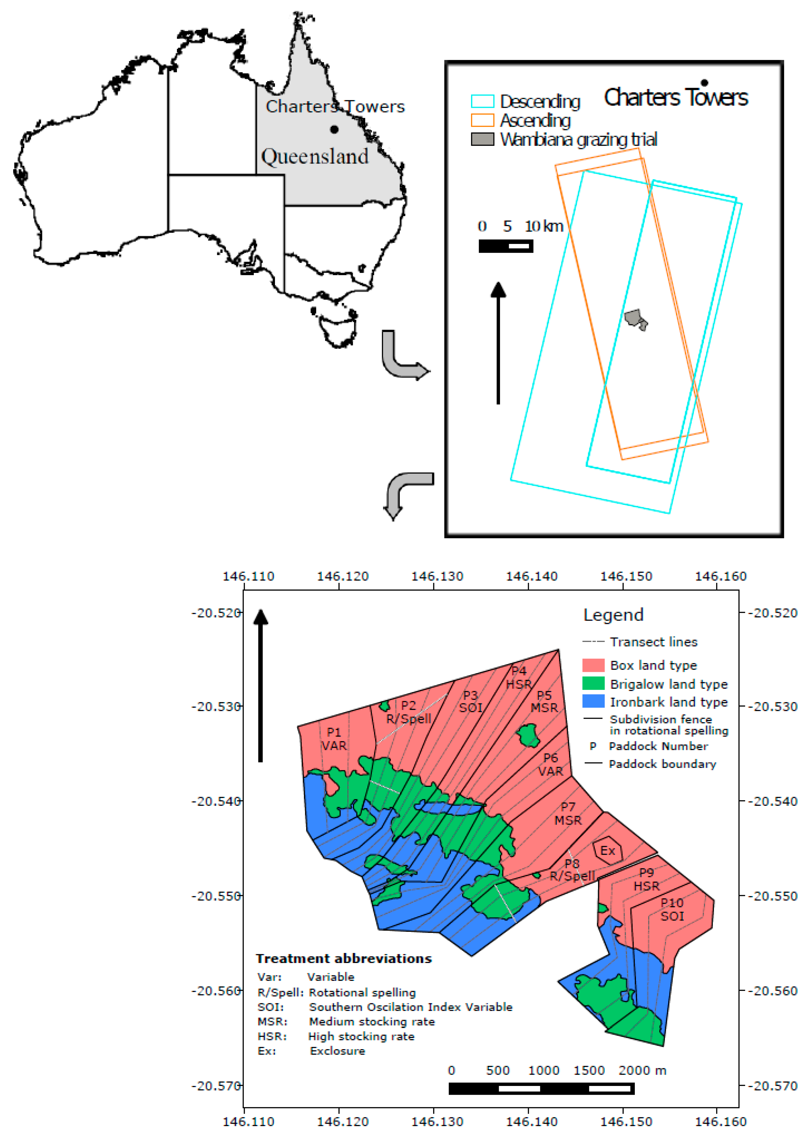 The Wambiana grazing trial is a small study area with relatively good observed field data, with the whole trial site of 10 paddocks (about 1000 ha) being typically about the size of a single paddock in the grazing systems for the region. Upscaling of the findings for wider applications would be desirable, e.g., using TSX ScanSar mode (up to 18.5 m resolution) or Wide ScanSar (up to 40 m resolution) with swath width of approximately 100 km and 270 km, respectively. The HV polarisation did not add significantly to a TSDM model and was thus not included in further analysis. The investigation of quad polarisation may give more insight, or dual polarisation with VV as an additional variable. A time series of X-band imagery over the full duration of a wet and dry season would be ideal to evaluate the ‘within-season’ temporal behaviour. The characterisation of a more general TSDM model would also entice monitoring over longer time spans to cover a range of different seasons temporally, a range of different soil types spatially, and a range of different vegetation types structurally.