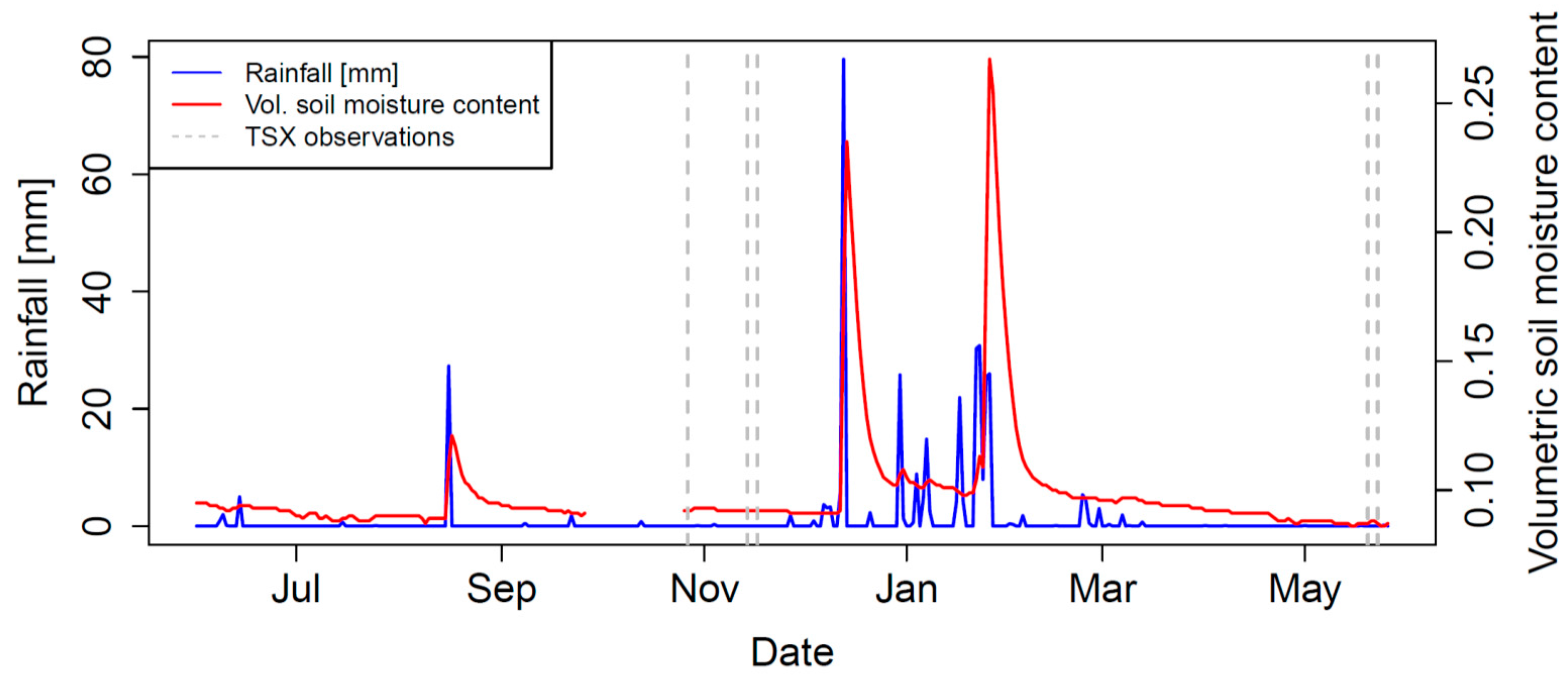 36]. The soil surface was quite dry for all image acquisitions and slightly drier in the May 2015 data acquisitions. The average maximum day and minimum night air temperatures were 41.1 °C and 14.1 °C during the TSX observation period October 2014; and 32.4 °C and 11.0 °C in May 2015.