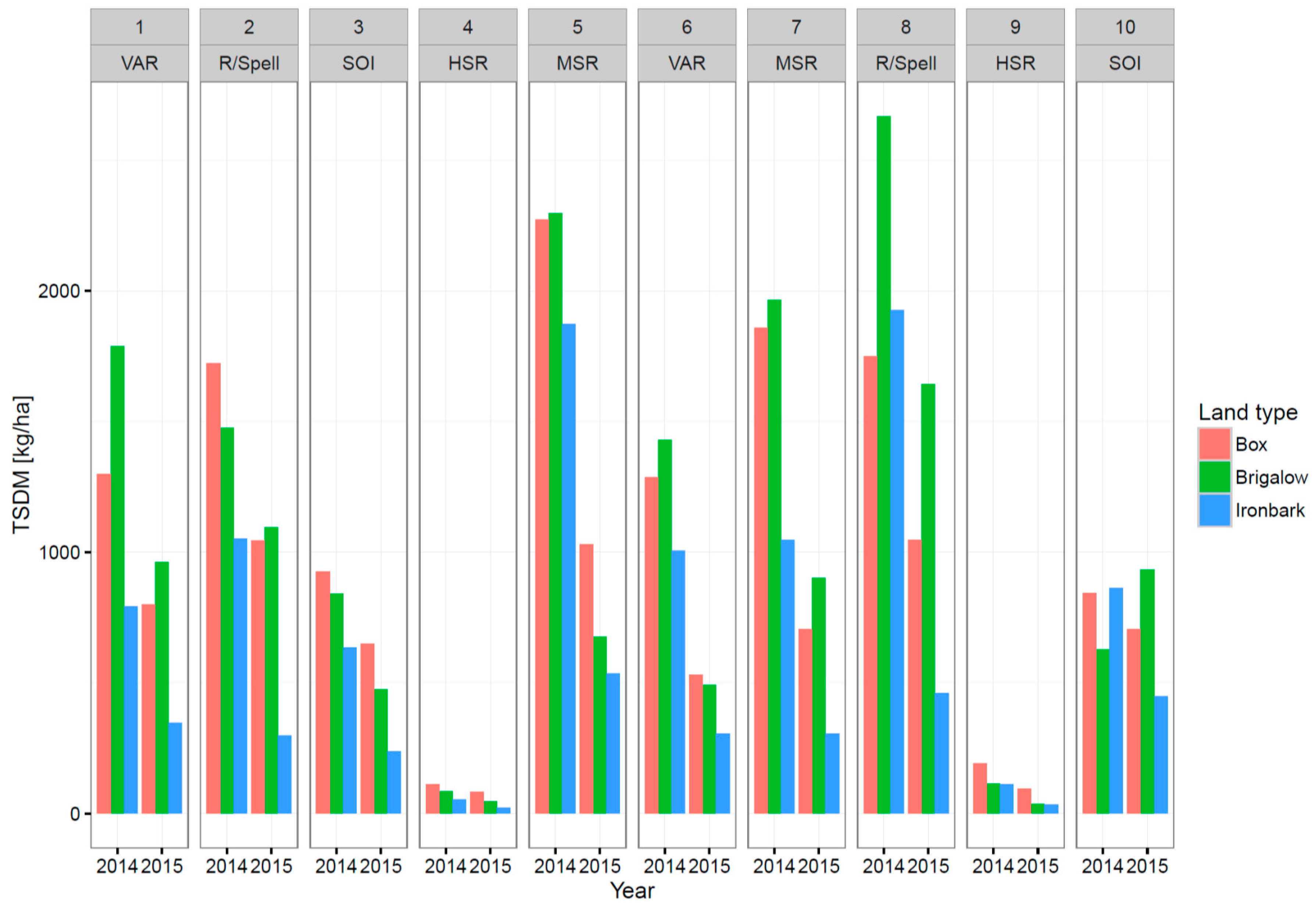 Figure 10) show a general decrease in TSDM from 2014 to 2015, with some localised deviations. The high stocking rate Paddocks 4 and 9 stand out clearly and are low in comparison to the other grazing strategies, such as the MSR in Paddock 5 and 7, which had the highest TSDM. The Box land type in the HSR paddocks (4 and 9) show a relative increase in TSDM in 2015 compared to 2014, which is in contrast to the field observations (