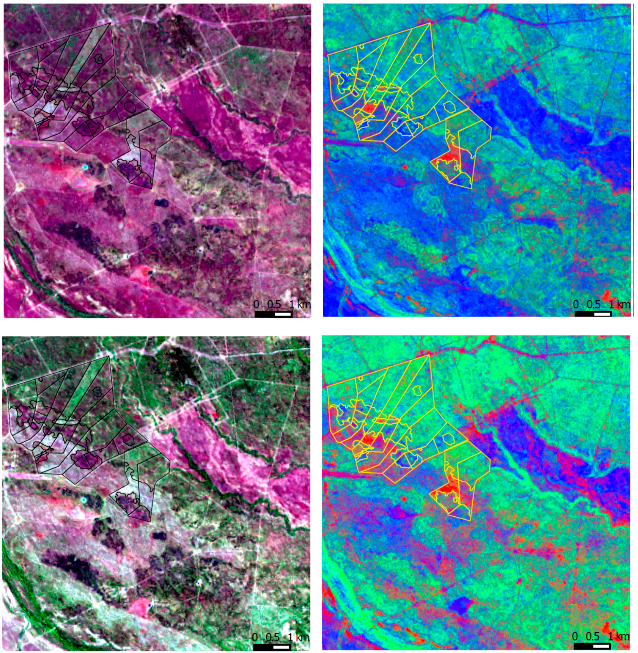 The paddocks with different grazing treatments are visible in the R/G/B and the FVC imagery as well as the difference in greenness and vegetative cover between the two seasons.