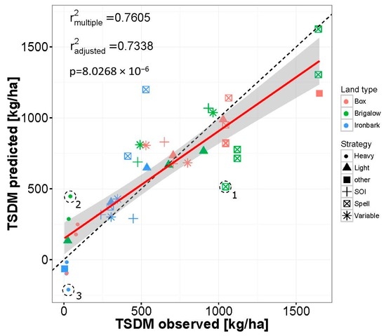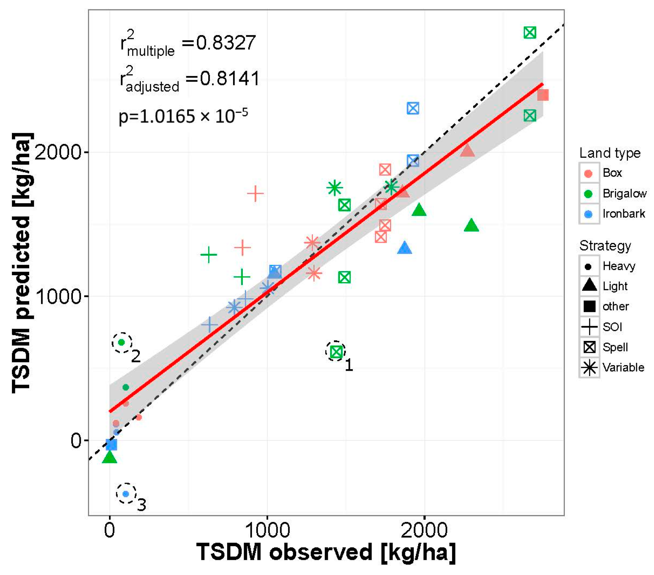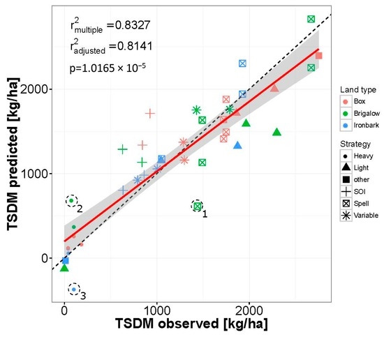 Figure 6). Point 1 refers to a small scalded area, approximately 90 m in diameter on Brigalow land type in Paddock 2. Given the nature of the TSDM field data transects, it is conceivable that the observations are too high in both seasons—the transects may not have intersected in this small area and the surrounding high yield box land type area estimates were attributed instead. Point 2 has high predictions in both models, which may be attributable to a levee bank to retain water and the associated disturbed soil when it was established. This would most certainly alter the TSX backscatter signal. Point 3 in both seasons predicted negative TSDM values. It happens that this is the paddock with lowest cover at low FPC and therefore the data point is at the extreme end. The red square represents the grazing exclosure (shown as Ex in