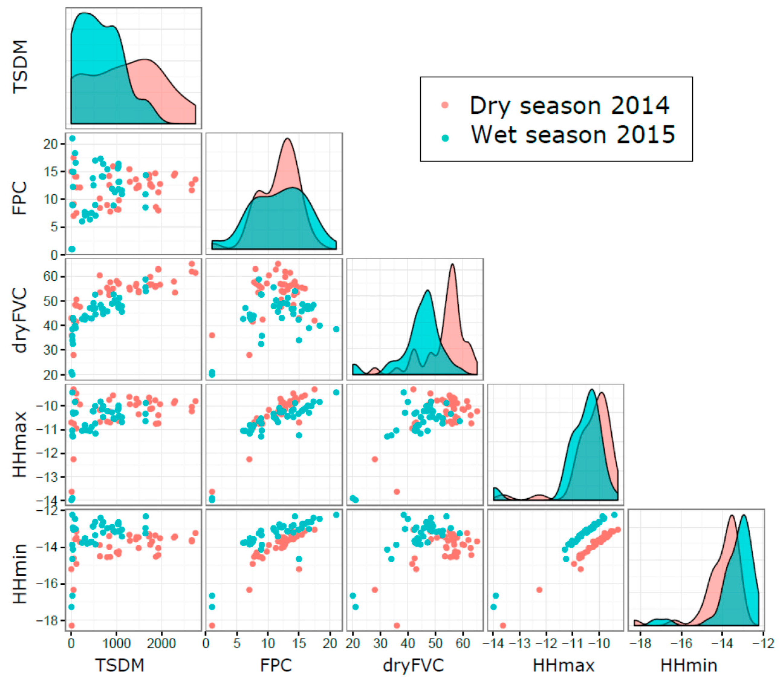 There appears to be an offset between the 2014 dry season and 2015 wet season data, most evident in the data pairs of FPC and TSX HHmin and also HHmax. The tree species in the study area are likely to exhibit an increase in litter fall and hence reduced FPC during a dry season. In another tropical savanna system, the woody species within crown overstorey FPC changed up to 20% between the wet and dry seasons for some evergreen species and up to 40% when averaged over 49 species including evergreen, partly, and fully deciduous [