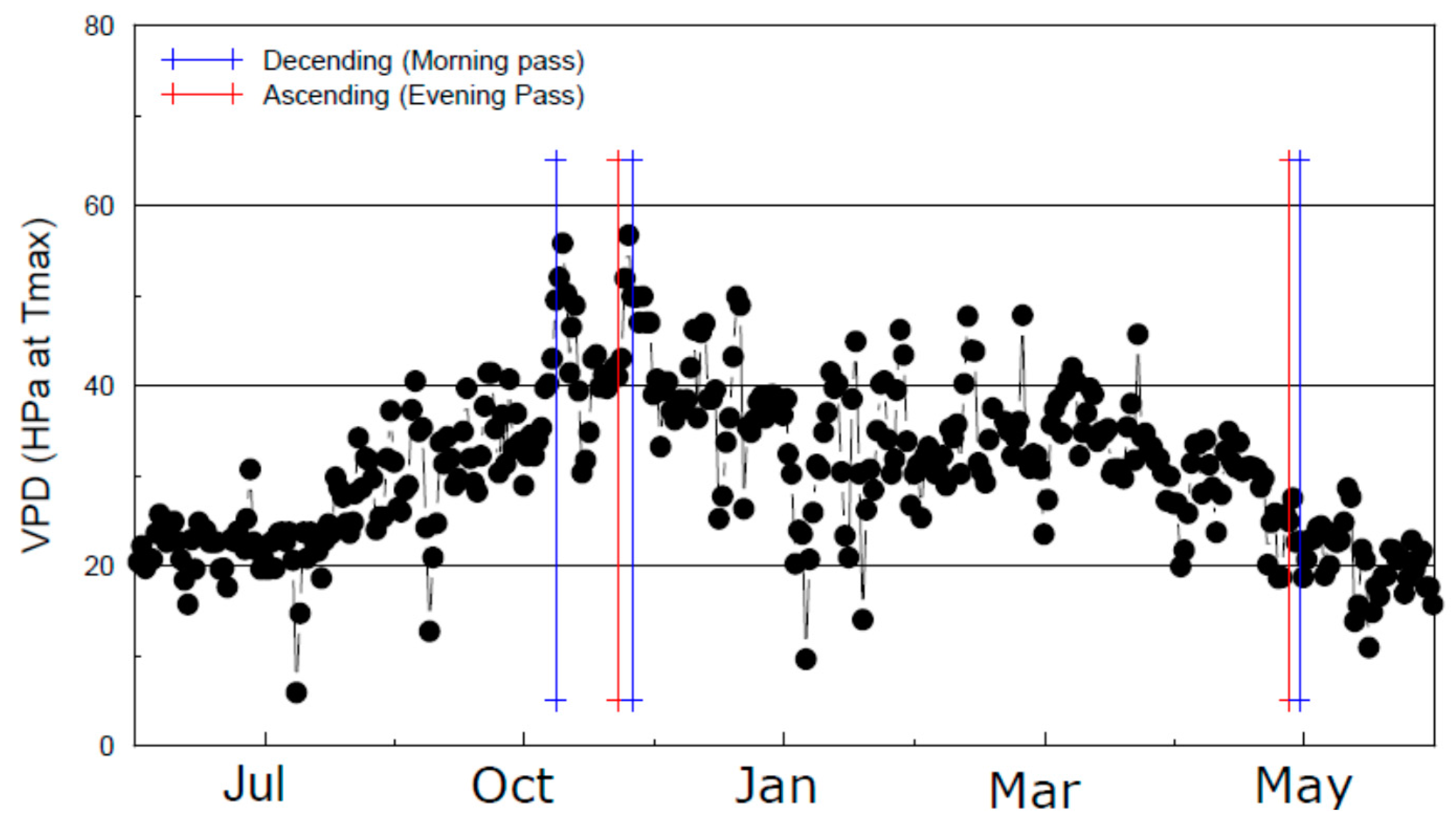 The vapour pressure deficit (VPD) was calculated from the SILO vapour pressure data following [