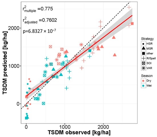 2 and MRSE) sacrificed, with the benefit of a more robust model with more data points. The MRSE values for the calibrated dataset are encouraging; however, the MRSE as a percentage of the mean TSDM for dry, wet, and combined seasons is 28%, 41%, and 40% respectively, which is still high relative to the planned pasture usage by cattle (about 20% of annual growth). A 40% error in TSDM estimation is, however, still an improvement over the current state as landholders often have only a vague idea about TSDM on their property as destructive measurements are expensive and impractical. Other forms of TSDM estimates vary greatly between methods, observers, and grass species [