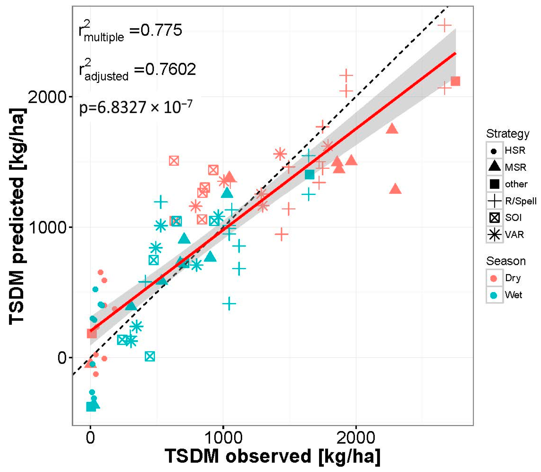 The MRSE was lower for 2015, perhaps because the total TSDM values were lower. A combined model for both seasons was established—with this approach there was some nominal model accuracy (r