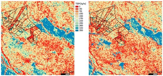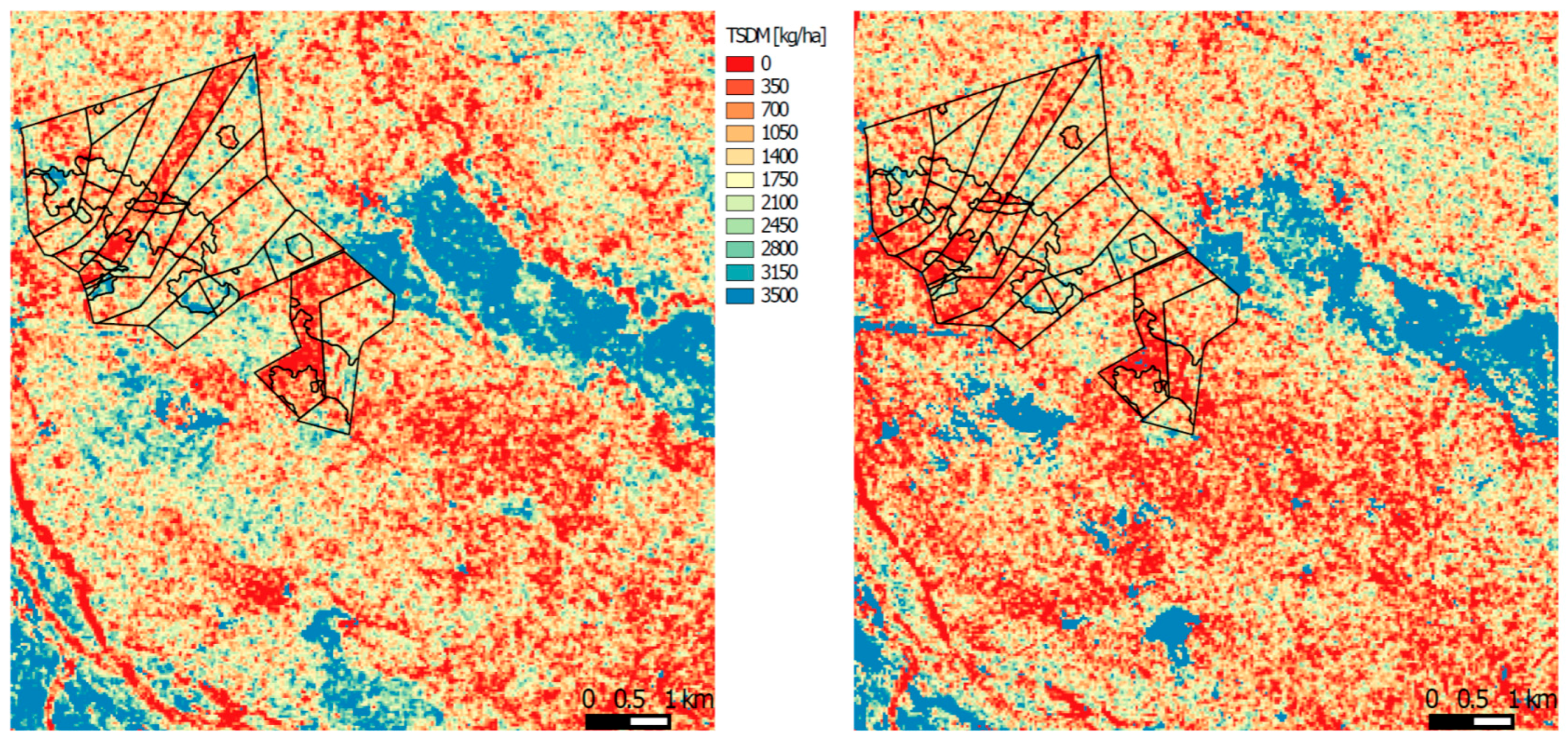 Figure 10. The model was restrained to the available data range such that negative predictions were set to zero and the upper values were capped at 3500 kg/ha TSDM.