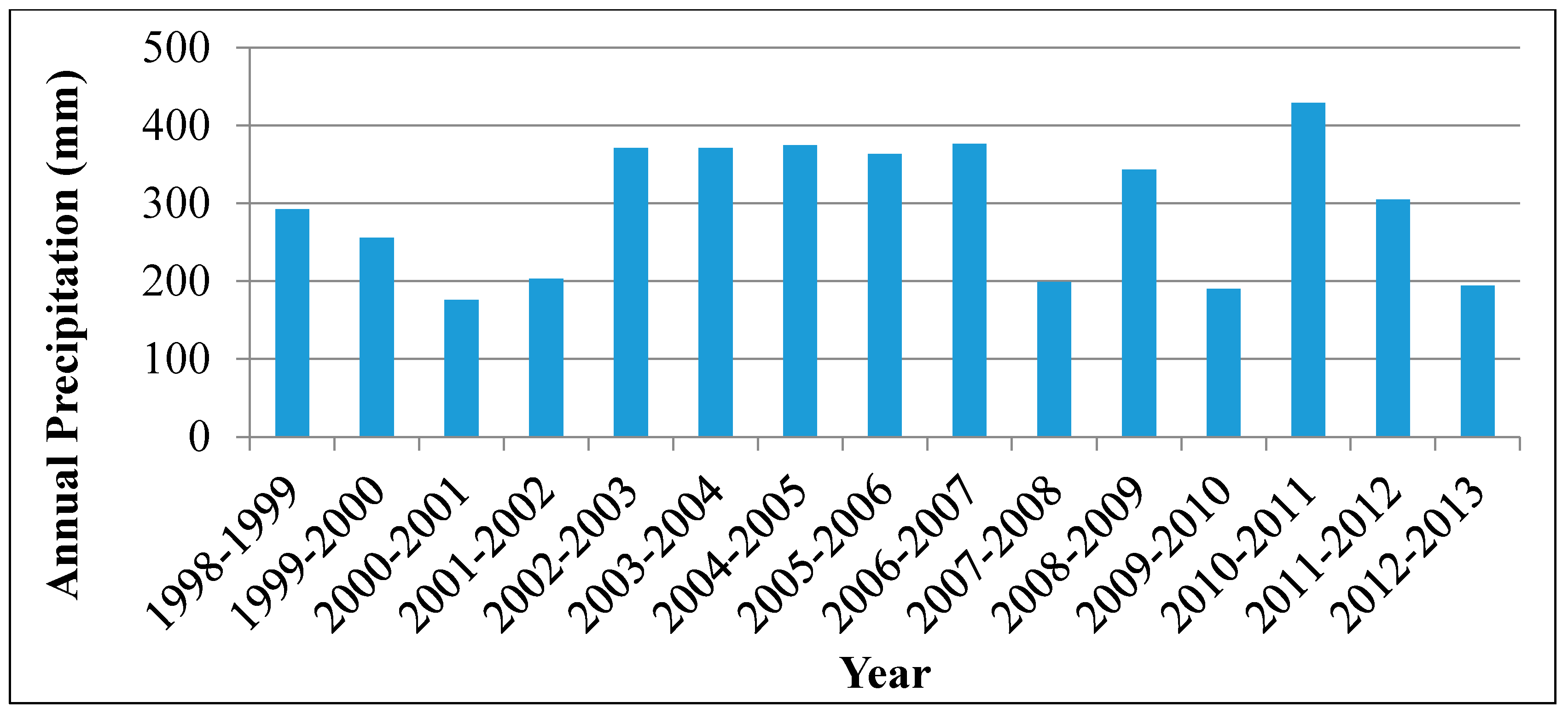 Annual precipitations over the studied period (1998–2013).