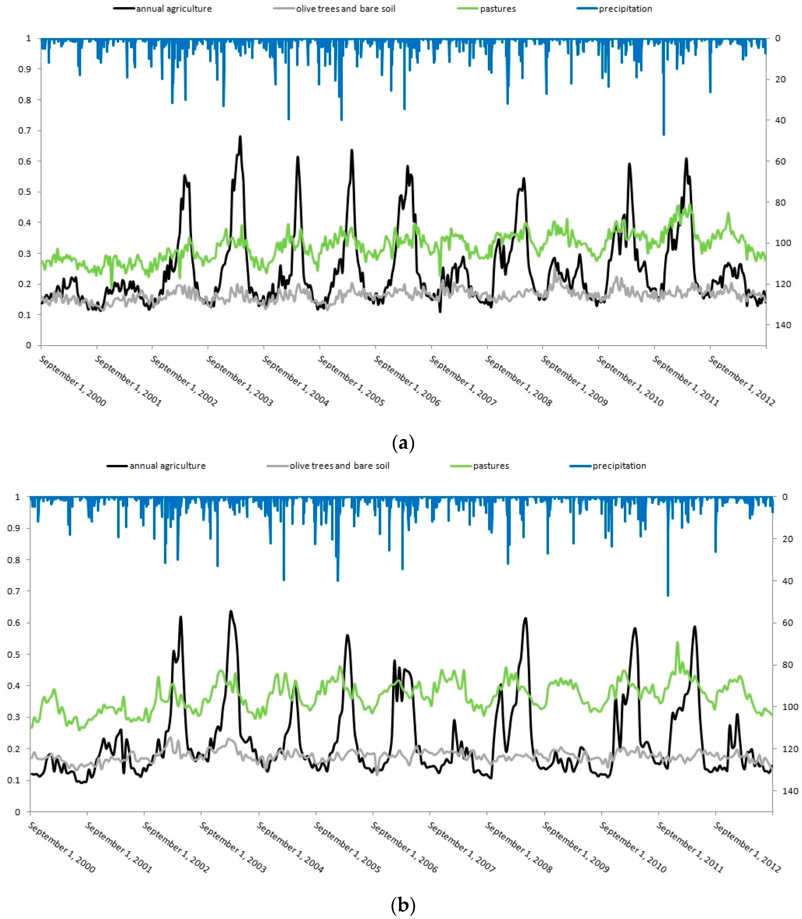 In order to accurately analyze the vegetation dynamics corresponding to the different types of vegetation cover present at the studied site, it is essential to consider annual land use maps. As a consequence of the lack of high-resolution satellite images, suitable for the retrieval of land-use maps for all of the studied years between 1998 and 2013, we adopt an approach based on the use of low spatial resolution SPOT-VGT and TERRA-MODIS NDVI images. For this, we consider three characteristic classes, labelled: “olive trees and bare soil”, “annual agriculture” and “pastures”. As shown by the NDVI time series, olive groves are affected by quite small variations in NDVI, between dry and wet years, with the NDVI remaining very close to that of bare soil (between 0.15 and 0.2). The similarity of these values is due to the large average spacing between olive trees (between 15 and 20 m), as well as to the continuous use of soil tilling (up to five times per year), a practice that is commonly used to increase infiltration and eliminate the growth of grass and weeds following rainfall events. For this reason, we group olive groves and bare soils together in the same class of land use.