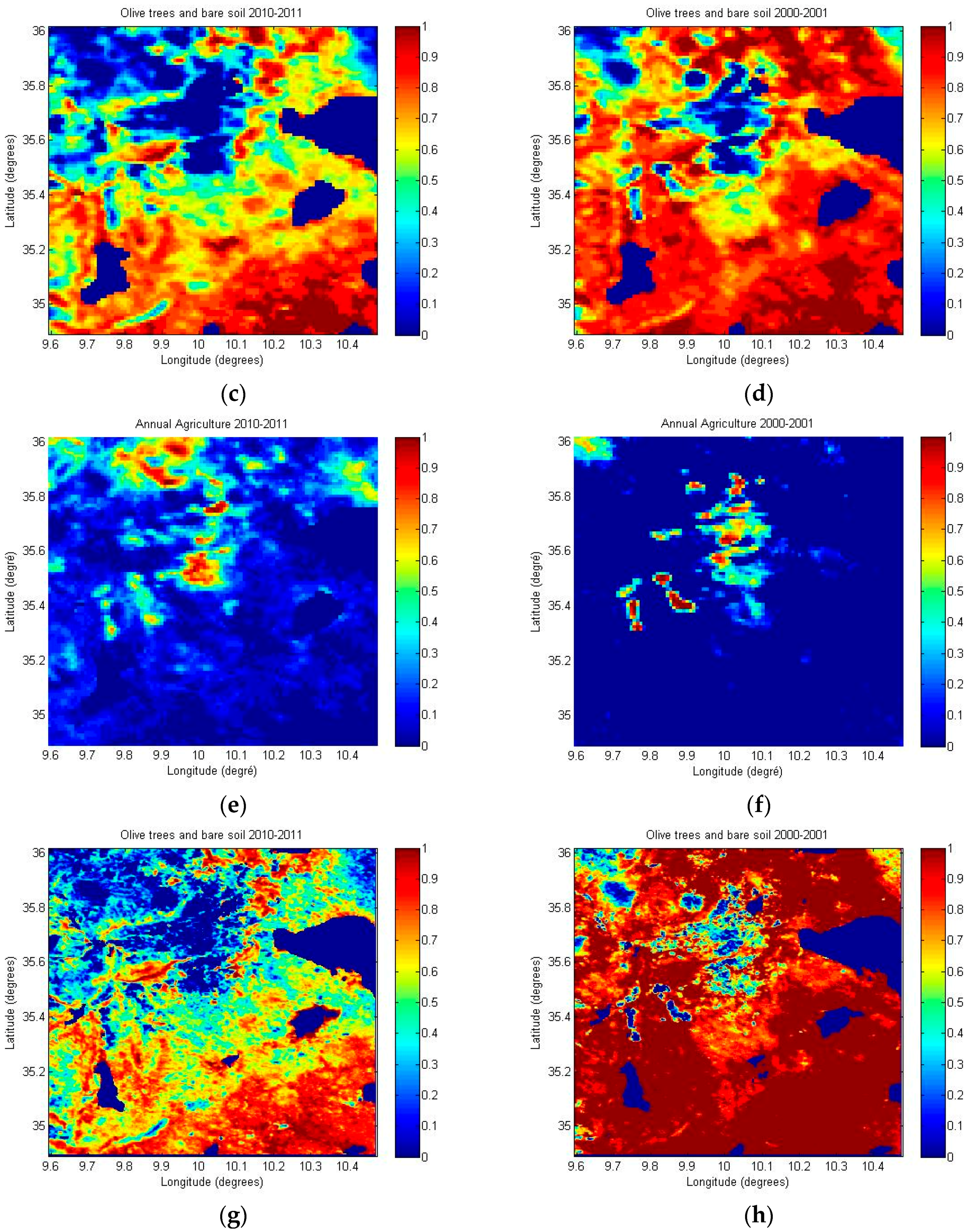 (a,b) “Annual agriculture” maps derived from SPOT-VGT observations for the wettest (2010–2011) and driest year (2000–2001); (c,d) “olive trees and bare soil” maps derived from SPOT-VGT observations for the wettest (2010–2011) and driest year (2000–2001); (e,f) “Annual agriculture” maps derived from TERRA-MODIS observations for the wettest (2010–2011) and driest year (2000–2001); (g,h) “olive trees and bare soil” maps derived from TERRA-MODIS observations for the wettest (2010–2011) and driest year (2000–2001).