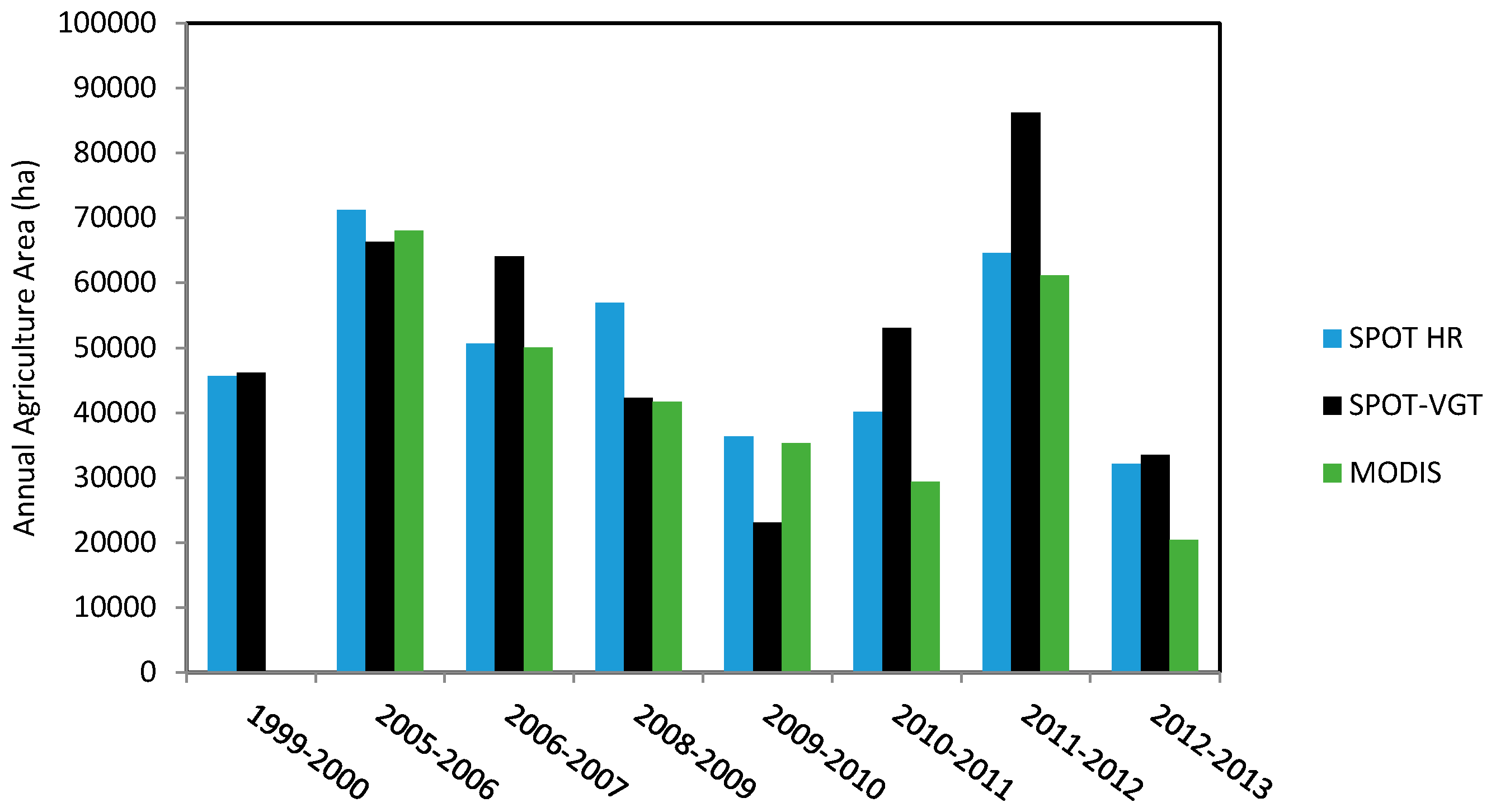 A linear mixing theory developed by Settle et al. [27] is considered, in which it is assumed that the reflectance (respectively NDVI) of a mixed pixel is given by the sum of the mean reflectance (respectively NDVI) values of the different land cover classes within the pixel, weighted by their respective fractional covers. The first step in this approach involves the identification of typical NDVI profiles, representative of each of the above land cover classes in the disaggregation methodology. For this step, we consider information related to the class composition of each pixel, retrieved from a high-resolution land-cover map. Disaggregation techniques are designed to estimate the annual proportion (between 0 and 1) of specific classes occurring within each pixel, by considering the NDVI time series acquired for each year. The result is a set of three fractional images, each corresponding to one specific class of land-cover. While this information describes the composition of each pixel, it does not provide any indication as to how the classes are spatially distributed within each pixel. Figure 4 illustrates the results of the three land use mapping using SPOT-VGT and MODIS data for the wettest (2010–2011) and driest (2000–2001) years. A qualitative comparison of the SPOT-VGT and MODIS land use maps shows that they are in good agreement. Approximately the same areas are retrieved, corresponding to a strong presence of “annual agriculture” or “pasture” or “olive groves and bare soil”. During dry years, a clear decrease is observed in the presence of annual agriculture. In order to verify the accuracy of the land use maps produced from low-resolution satellite images, we compared high-resolution SPOT-HRV maps of annual agricultural areas with the proposed low-resolution SPOT-VGT and TERRA-MODIS NDVI maps over a period of eight years, for which high-resolution satellite data exists. Table 1 shows the SPOT-HRV and LANDSAT high-resolution images used to produce the high-resolution land-use maps, for the eight agricultural seasons.