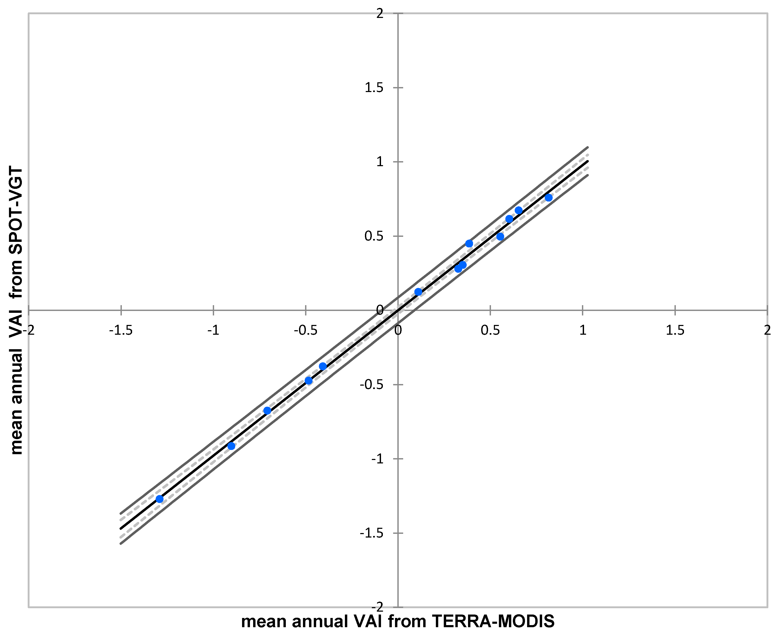 Relationship between the VAI indices estimated annually from TERRA-MODIS and SPOT-VGT data.