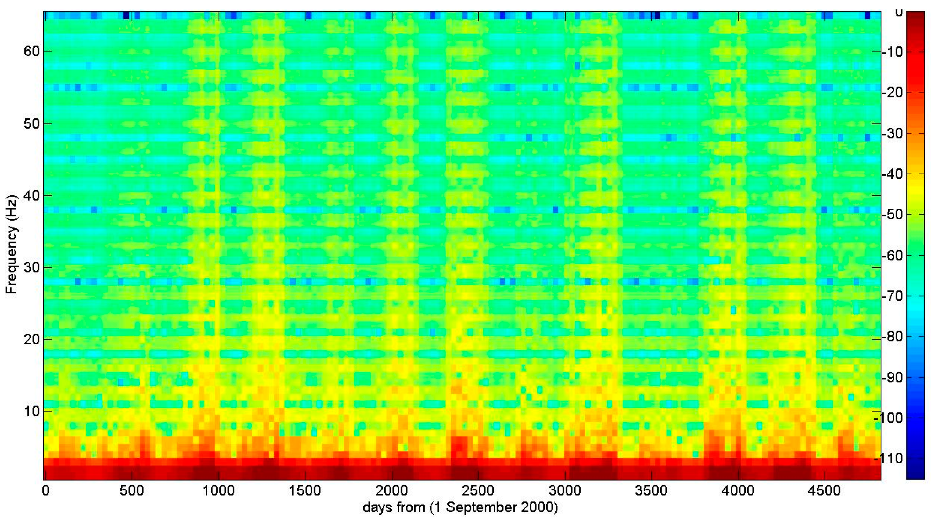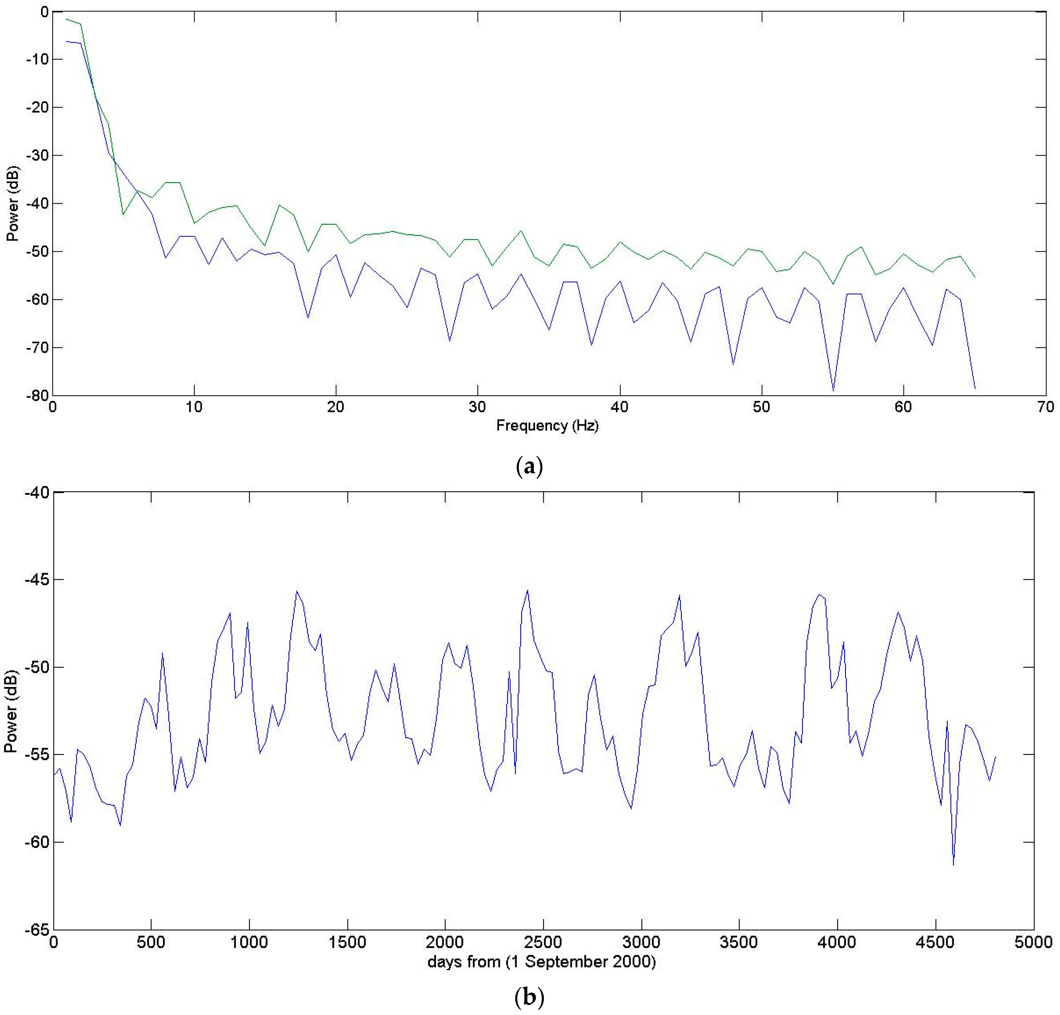(a) Spectrogram dynamics as a function of frequency, for a dry and a wet year; (b) Spectrogram dynamics at a high frequency (Fr = 30 Hz).