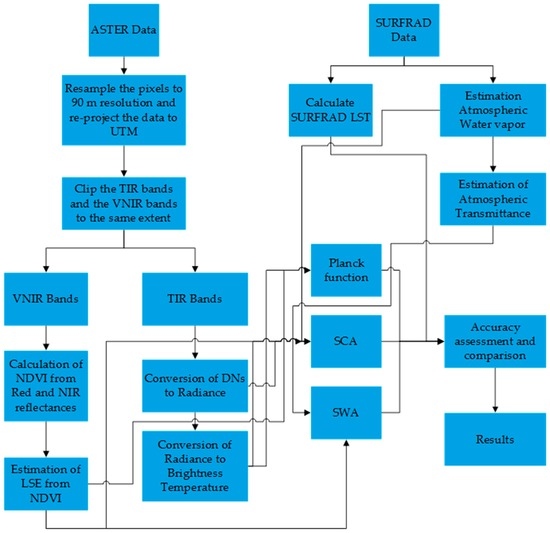 where w13 and w14 represent the atmospheric water vapor content while τ13 and τ14 represent the band atmospheric transmissions for ASTER band 13 and ASTER band 14, respectively. Figure 1 shows the summary of the methodology used in the study.