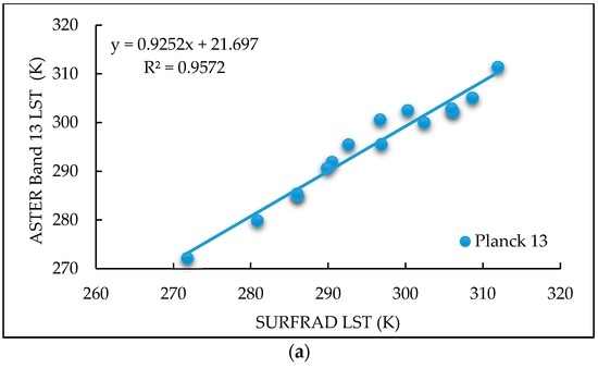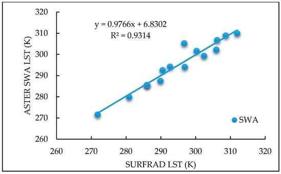 In this study, the LST values obtained from the SWA produced a negative bias value in comparison to the LSTs derived from SURFRAD data. The algorithm produced a bias value of −0.08 K and a standard deviation of 2.40 K. It produced a regression coefficient of 0.9314 in relation to the data obtained from the SURFRAD stations. Figure 4 shows the scatter plots of the LSTs derived from ASTER using the SWA, ASTER band 13 and ASTER band 14 in relation to SURFRAD data.
