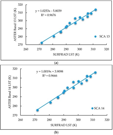 The LST values obtained from the SCA band 13 and band 14 produced positive bias values in comparison to LSTs derived from the SURFRAD measurements. The bias values of the values derived from ASTER band 13 and 14 were 1.65 K and 4.47 K, respectively, for all scenes used in the study. According to the regression analysis, which was performed to determine the relationship between the LST values obtained from the SCA and the LST obtained from the SURFRAD data, a high correlation was obtained between the values: a correlation coefficient of 0.9676 was observed using the SCA and ASTER band 13 and a correlation coefficient of 0.9666 was observed using the SCA and ASTER band 14. The SCA produced LST values with standard deviations of 1.11 K and 2.35 K for ASTER band 13 and band 14, respectively. Figure 3 shows the scatter plots produced to show the relationship between the LSTs derived from ASTER band 13 and 14 from the SCA with SURFRAD data. The SCA produced the best results when band 13 was used.